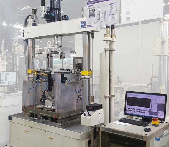 A test system designed to evaluate the performance and durability of shock absorbers under various load conditions, applied individually or in combination.